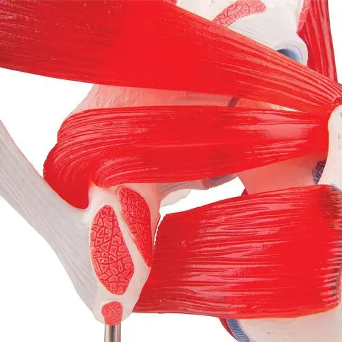 Este modelo ilustra la articulación coxofemoral derecha en un hombre; Allí se ven diversos músculos, así como las zonas de inserción muscular distal y proximal del fémur y del hueso ilíaco. Con fines didácticos, las superficies musculares de las zonas distal y proximal están elevadas y coloreadas de forma diferente (inserción distal = rojo; inserción proximal = azul). Los diversos músculos de la cadera están dispuestos en las respectivas superficies de sus inserciones distales y proximales, lo que permitirá su extracción.